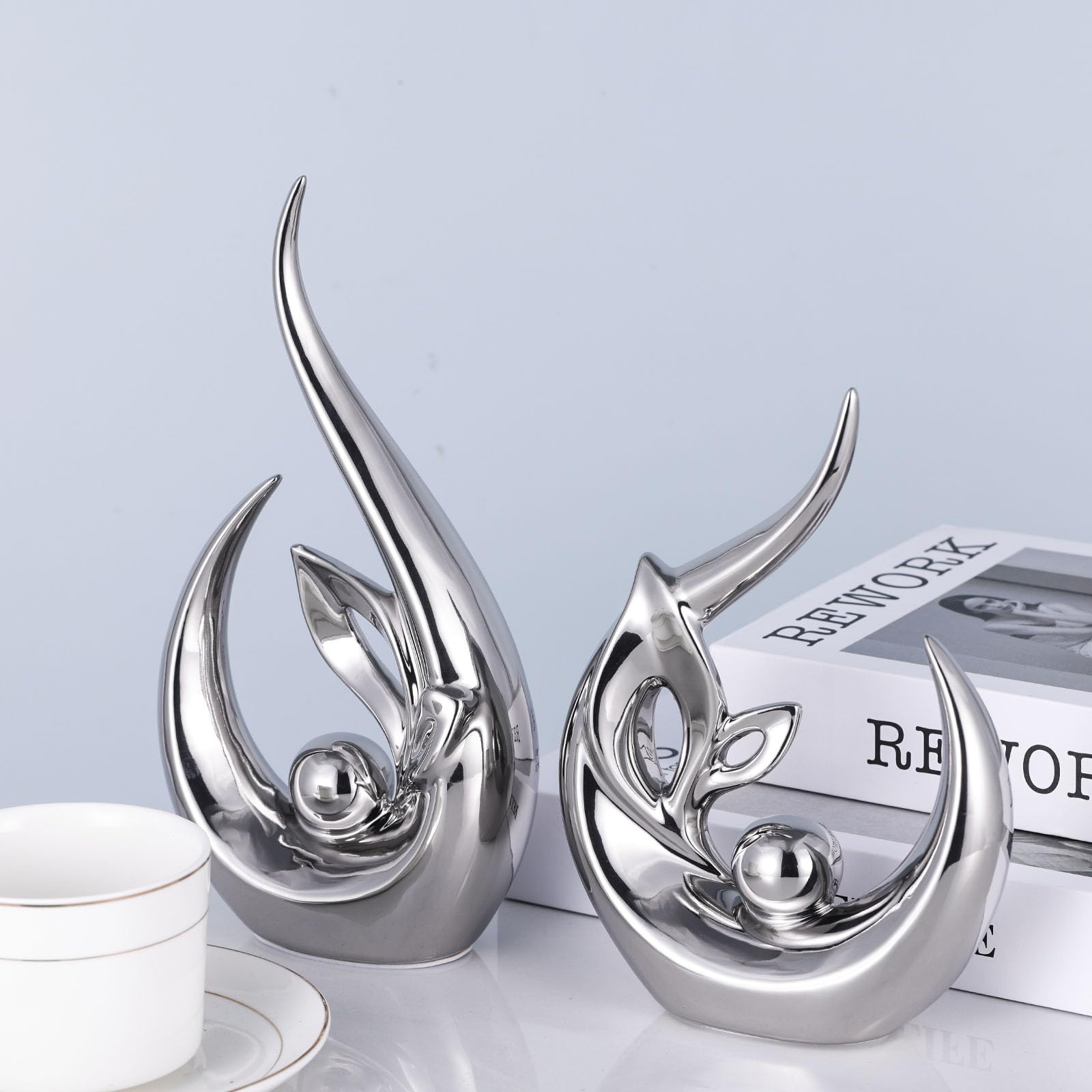 XMGZQ Silber Keramik Statue Satz von 2,Moderne Abstrakte Skulptur Design,24 cm Porzellan Figuren Haus Deko,Tischdekoration für Wohnzimmer,Schlafzimmer,Esszimmer,Büro,Kunststatue